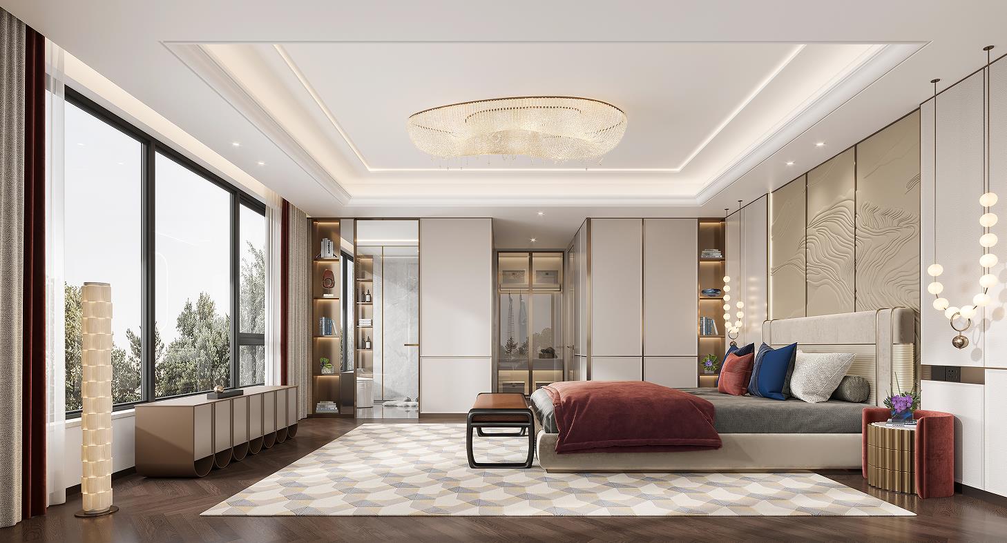 二層主臥入戶門采用了雙開門入戶形式,配備了功能完備,且尺度寬闊的全定制衣帽間及獨立衛浴室。淺藍色極具包裹感的床,愜意而溫暖,獨特的選型成為主臥的視覺亮點,展現著主人時尚大氣的品味特質。