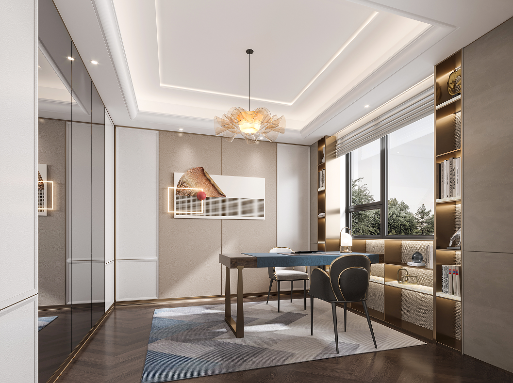層主要工作臺作為空間的穩定面,造型簡潔飄逸的燈飾,猶如流星的痕跡,靈動跳躍在空間之中,精致優雅且不失穩重。